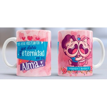 Taza con motivo amoroso. Incluye el texto: Eres ese instante que dura una eternidad en mi alma.Personalizable con nombres