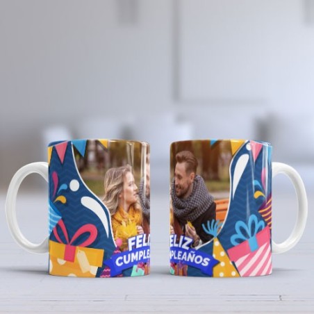 Taza con diseño especial para cumpleaños. Incluye la frase: Feliz cumpleaños. Personalizable con foto