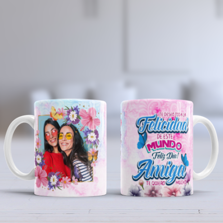Taza con diseño especial para el día de la mujer. Incluye la frase: Te deseo toda la felicidad de este mundo. Feliz día amiga, te quiero mucho. Personalizable con foto.