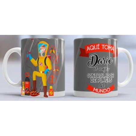 Taza con diseño especial para la profesión de: Controlador de plagas. Con el texto: Aquí toma NOMBRE el mejor Controlador de plagas del mundo. Personalizable con el nombre.