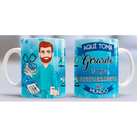 Taza con diseño especial para la profesión de: Fisioterapueta. Con el texto: Aquí toma NOMBRE el mejor Fisioterapueta del mundo. Personalizable con el nombre.