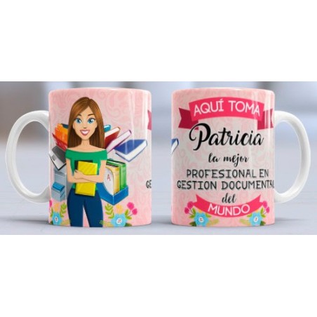 Taza con diseño especial para la profesión de: Gestión Documental. Con el texto: Aquí toma NOMBRE la mejor Profesional en Gestión Documental del mundo. Personalizable con el nombre.