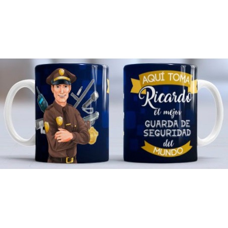 Taza con diseño especial para la profesión de: Guarda de seguridad. Con el texto: Aquí toma NOMBRE el mejor Guarda de seguridad del mundo. Personalizable con el nombre.