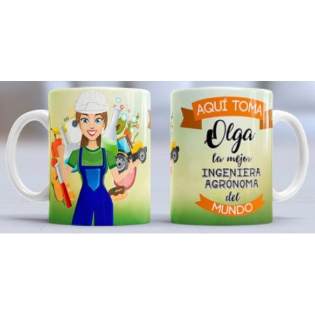 Taza con diseño especial para la profesión de: Ingeniera Agrónoma. Con el texto: Aquí toma NOMBRE la mejor Ingeniera Agrónoma del mundo. Personalizable con el nombre.