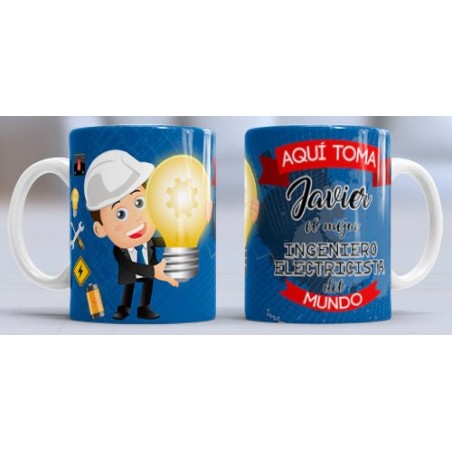 Taza con diseño especial para la profesión de: Ingeniero Electricista. Con el texto: Aquí toma NOMBRE el mejor Ingeniero Electricista del mundo. Personalizable con el nombre.