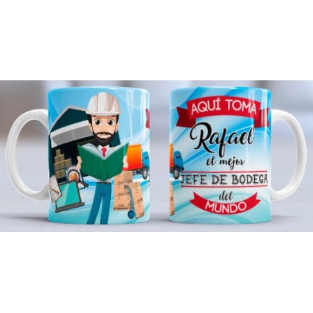 Taza con diseño especial para la profesión de: Jefe de Bodega. Con el texto: Aquí toma NOMBRE el mejor Jefe de Bodega del mundo. Personalizable con el nombre.