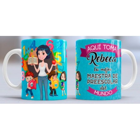 Taza con diseño especial para la profesión de: Maestra de preescolar. Con el texto: Aquí toma NOMBRE la mejor Maestra de preescolar del mundo. Personalizable con el nombre.