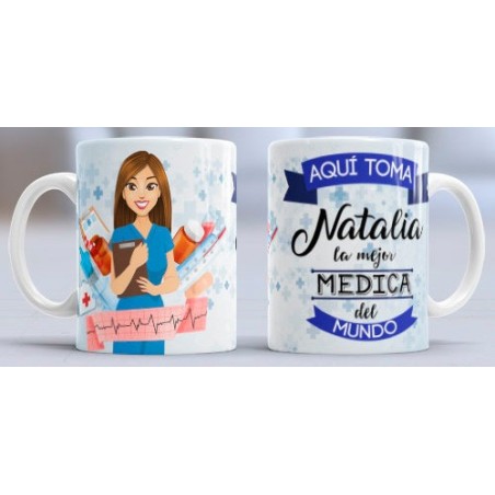 Taza con diseño especial para la profesión de: Médica. Con el texto: Aquí toma NOMBRE la mejor Médica del mundo. Personalizable con el nombre.