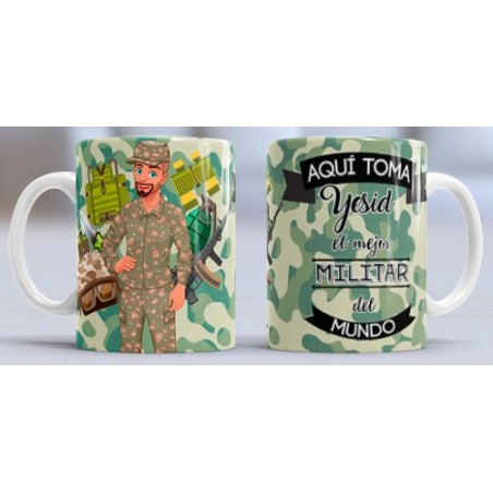 Taza con diseño especial para la profesión de: Militar. Con el texto: Aquí toma NOMBRE el mejor Militar del mundo. Personalizable con el nombre.