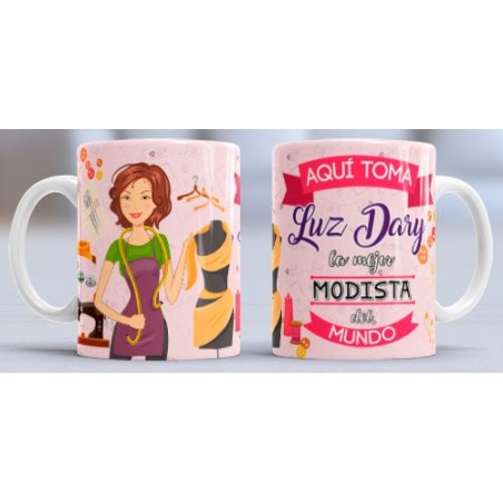 Taza con diseño especial para la profesión de: Modista. Con el texto: Aquí toma NOMBRE la mejor Modista del mundo. Personalizable con el nombre.