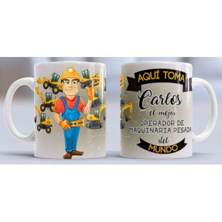 Taza con diseño especial para la profesión de: Operador de Maquinaria pesada. Con el texto: Aquí toma NOMBRE el mejor Operador de Maquinaria pesada del mundo. Personalizable con el nombre.