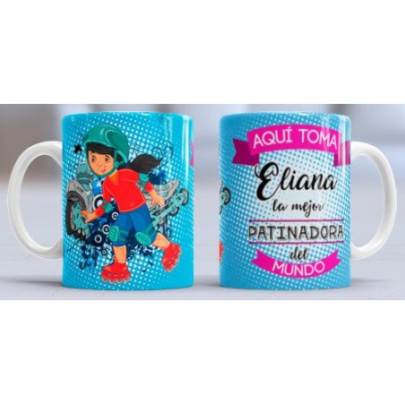 Taza con diseño especial para la profesión de: Patinadora. Con el texto: Aquí toma NOMBRE la mejor Patinadora del mundo. Personalizable con el nombre.