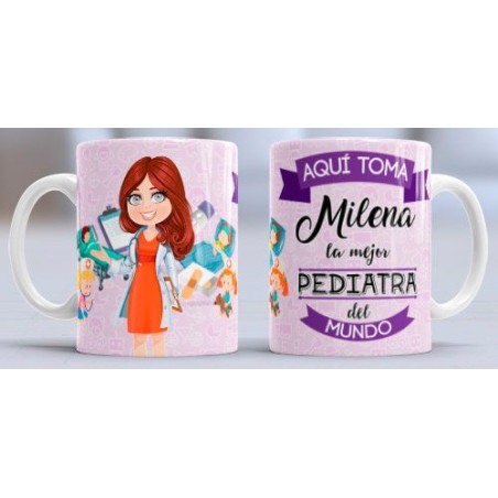 Taza con diseño especial para la profesión de: Pedriatra. Con el texto: Aquí toma NOMBRE la mejor Pedriatra del mundo. Personalizable con el nombre.